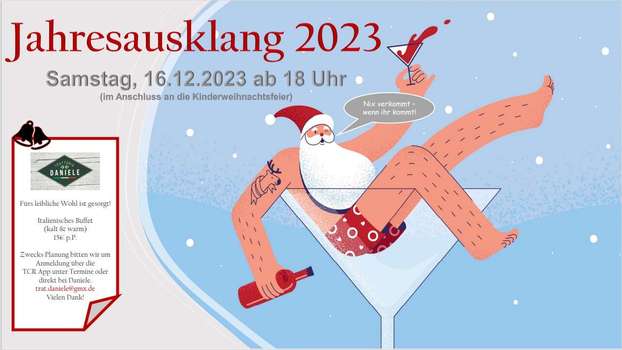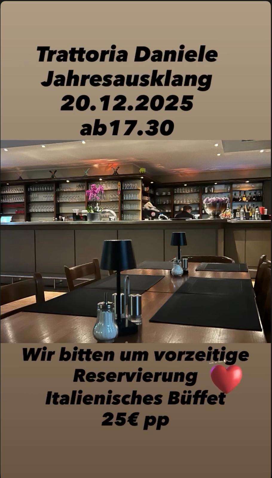 Der Jahresausklang in der Trattoria Daniele findet am Samstag, den 20.12. ab 17.30Uhr statt. Bitte für das italienische Buffet (25,- EUR p.P.) reservieren.