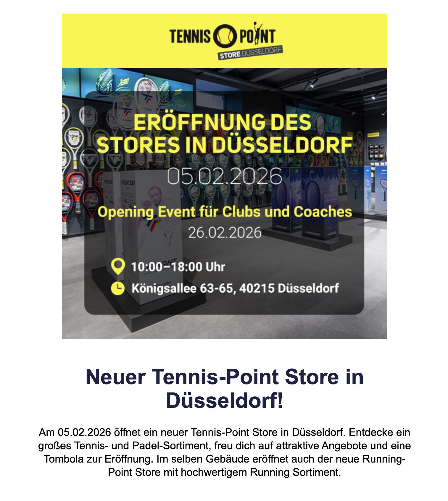 Am Donnerstag 05.02.2026 eröffnet der neue Tennis-Point Store in Düsseldorf!