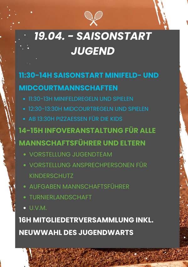 Wie im letzten Jahr startet die Jugend wieder mit einer Infoveranstaltung für alle MannschaftsführerInnen und Eltern in die Saison. Am 19.04. von 14-15h wird das Jugendteam Infos zur Mannschaftsführung, zu Turnieren und vielem mehr geben. Auch unsere Ansprechpersonen für den Kinderschutz, Sabrina und Christoph, werden vor Ort sein. Um 16h findet am gleich Tag die Mitgliederversammlung statt.
